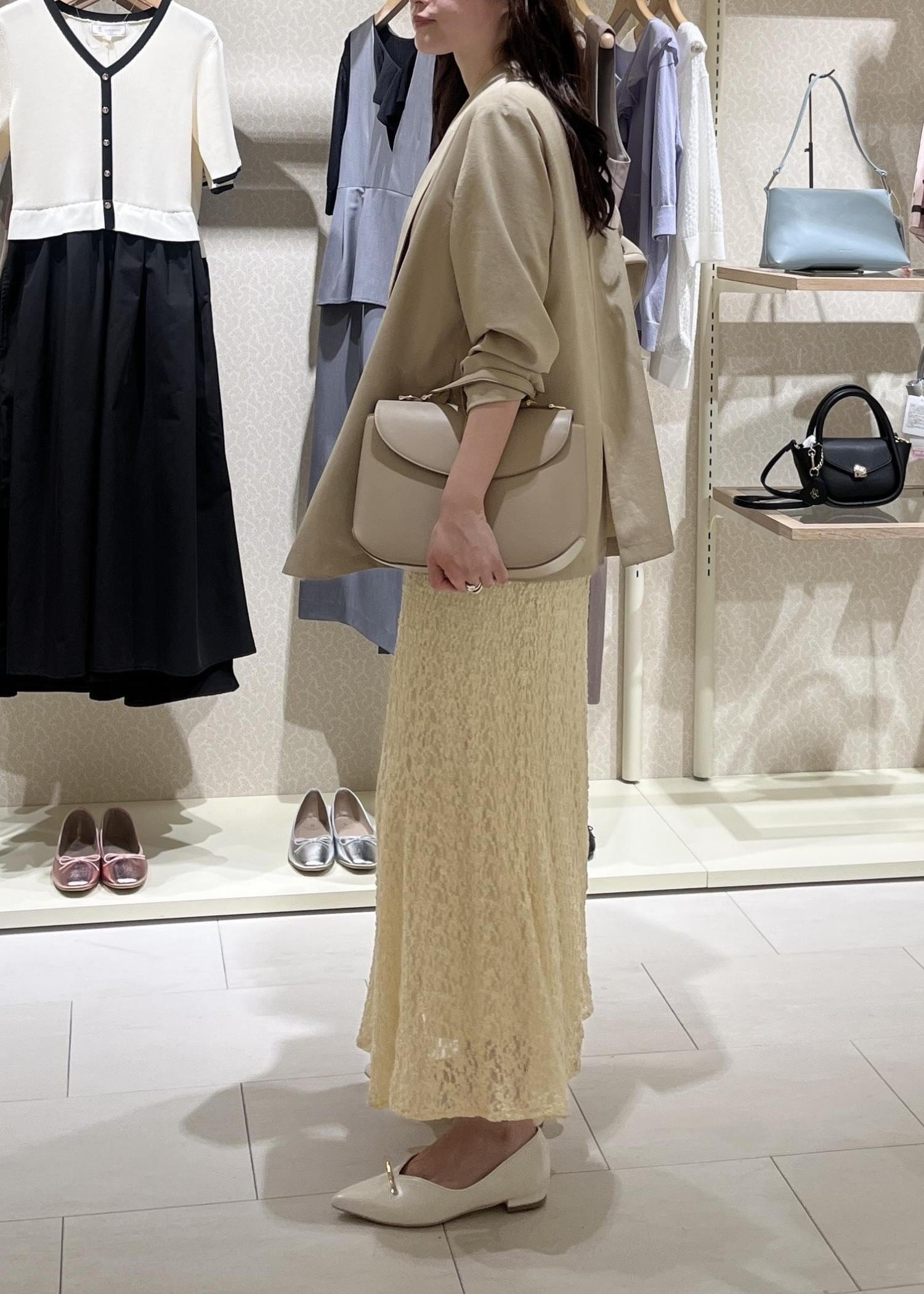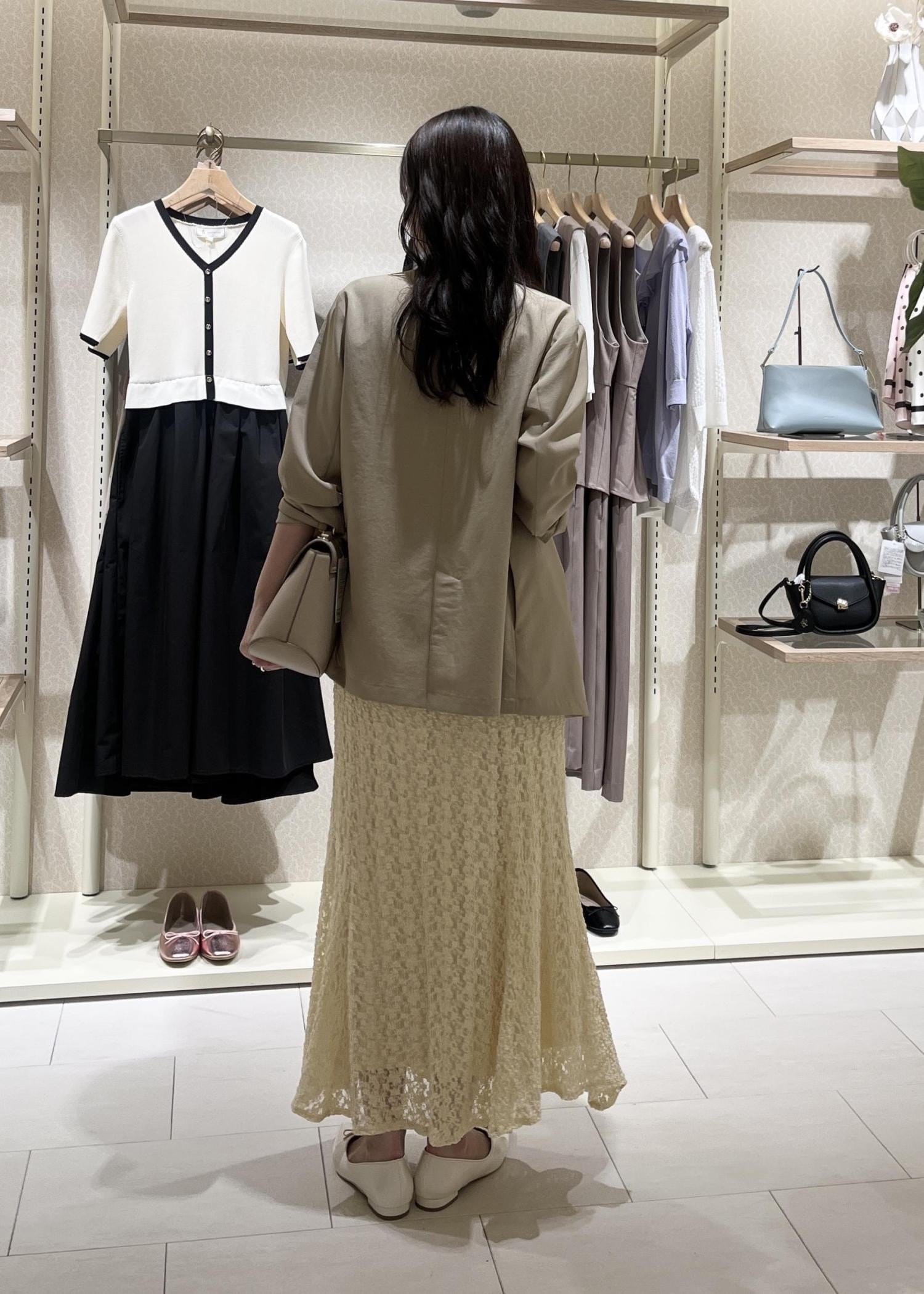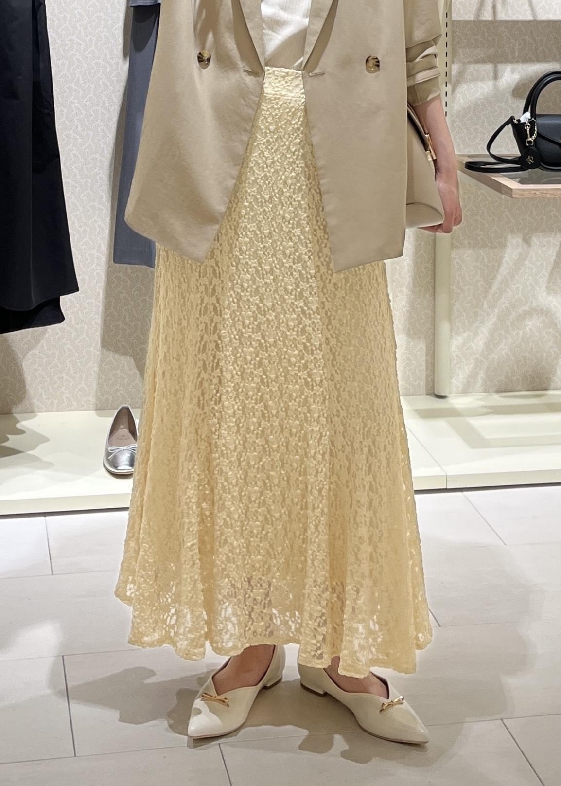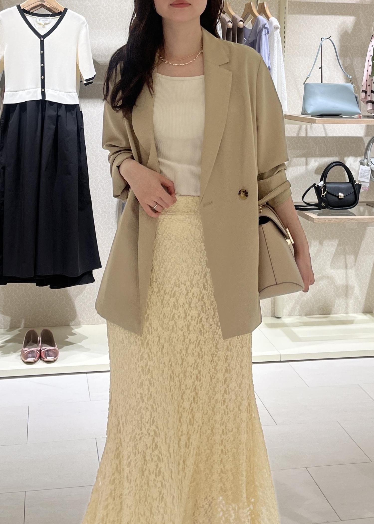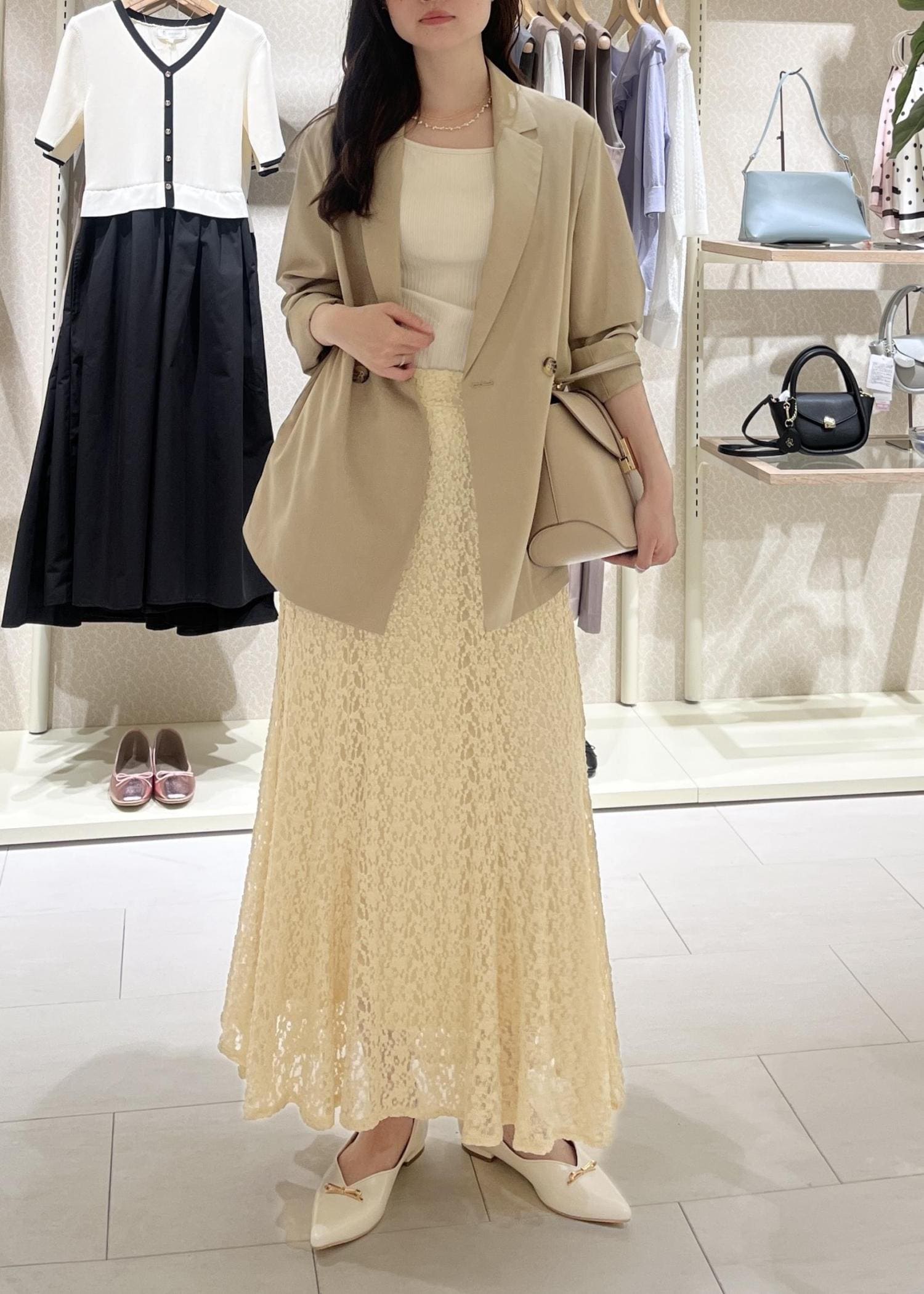 ベージュのジャケットをメインに、イエローのレースのスカートで華やかな淡色ジャケットコーデにしてみました!
