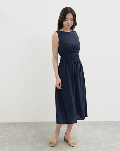 ウエストのシャーリングディテールが印象的なノースリーブワンピース。