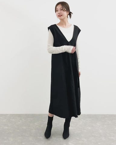 「美人シルエット」を瞬時にメイク。着るだけで縦長効果を発揮するVネックジャンパースカート。