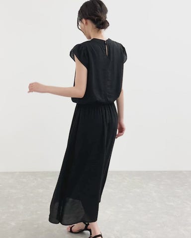 袖のフリルがさりげなく肩周りをカバーしながらも女性らしさを演出します。