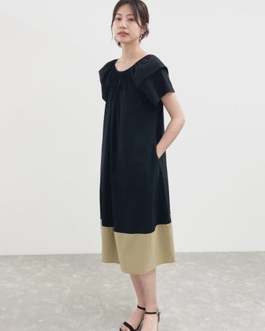 胸元から裾にかけて広がるゆったりとしたシルエットに、配色の切替デザインが洗練されたアクセントに。