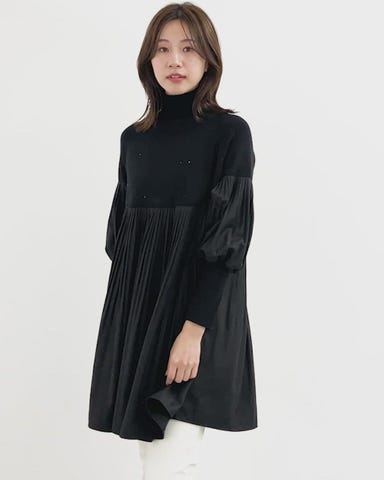 ラインストーン付プリーツ切替ニットワンピース