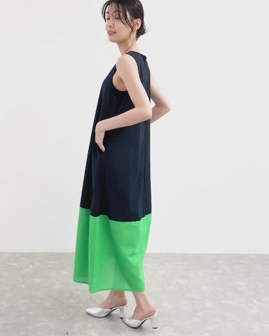 鮮やかなバイカラーが目を惹くノースリーブワンピース