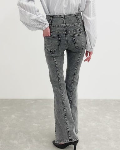 前脇クロス切り替えストレッチデニムフレアパンツ