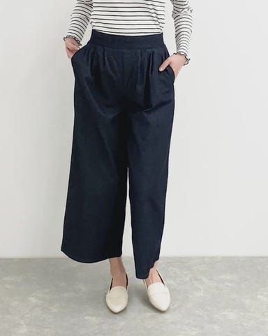 ・裾に向かってストンと落ちるワイドシルエットが脚のラインを拾わず、リラックス感がありながらもすっきりとした印象に。