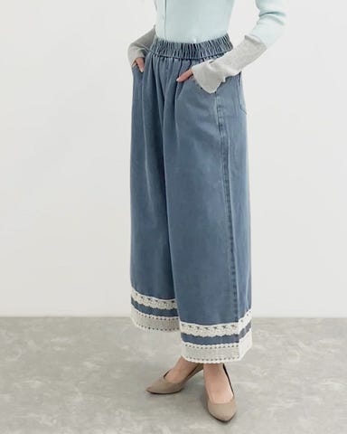 裾レースデニムワイドパンツ