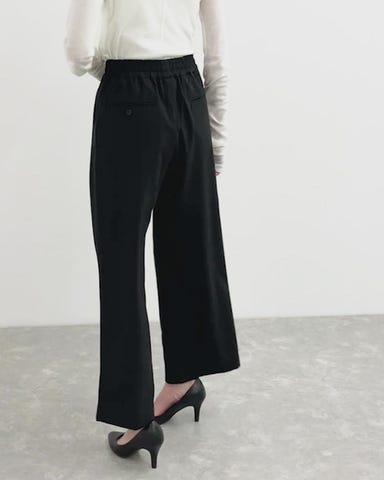 ・ウエスト総ゴム仕様でストレスフリーな穿き心地です。・程よくゆとりのあるシルエットで体型を拾わず安心感があります。・裾に向かってすとんと落ちるラインで、すっきり見え◯・フロントはタック入り、バックは片玉縁ポケット付きできちんと感もプラス。・オンオフ問わず使えるベーシックデザインで着回しやすいアイテムです。
