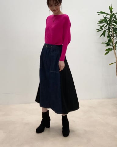 フロントはデニム、バックはプリーツの