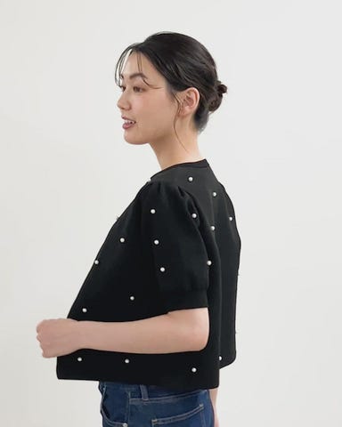 全体的にパールが散りばめられた女性らしいカーディガンです。