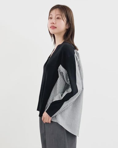 ・ニット×ストライプ布帛のドッキングデザインで、一枚で着映えするカーディガン。