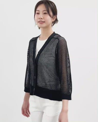 ほどよい透け感のあるメッシュ編みで、重たく見えず軽やかな印象のカーディガン。