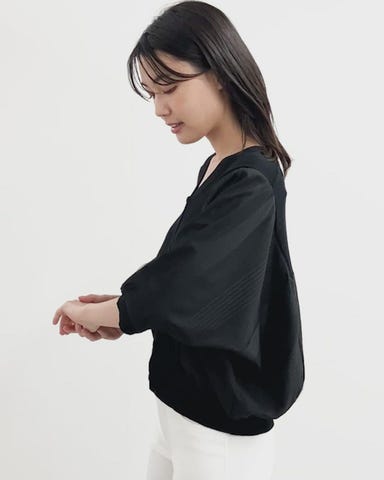 ドルマンスリーブとVネックデザインで顔まわりをすっきり見せつつ、ゆったりとしたシルエットがリラクシーな印象を与える一枚です。