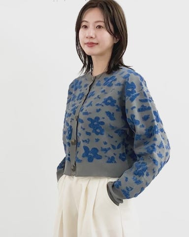 ・ふんわりとした風合いが魅力の花柄ショート丈カーディガン。