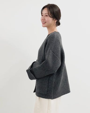 ・深めのVネックラインが、インナーとのレイヤードを楽しみつつ顔周りをシャープに演出。