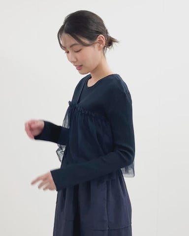 チュールを重ねたデザインが目を惹くニットカーディガン。