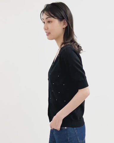 パールボタン×ラインストーンがフェミニンムードたっぷりなカーディガン。