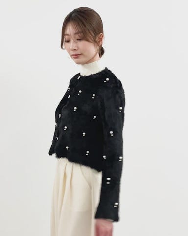 ・毛足の長いふわふわとしたフェザーと、フロントに散りばめられたパールとビジューが目を惹くカーディガン。