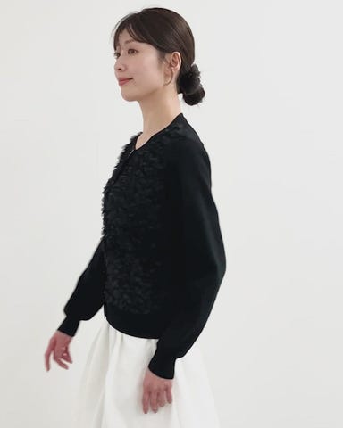 ・フロントに立体的な花モチーフをあしらった存在感のあるカーディガン。