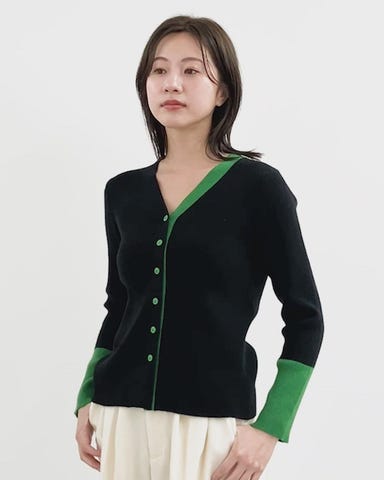 Vネックラインの配色アクセントが、目を惹きました!袖口にも配色アクセント。色の組み合わせがとっても好みです。フロントボタンも配色と合わせてあり、細部までこだわり抜いた個性的なデザインです。