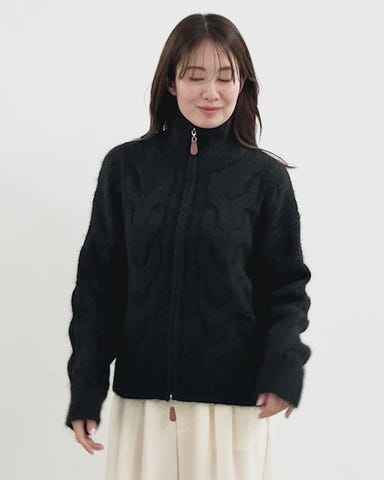・ケーブル編みの編み地が、シンプルなデザインに奥行きをプラス。