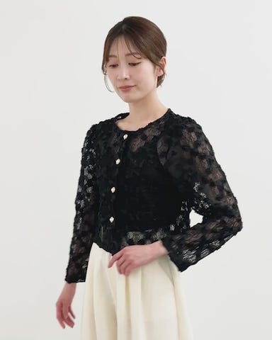 ・立体感のある花モチーフ:表面にあしらった花モチーフが着こなしに華やかさをプラスします。