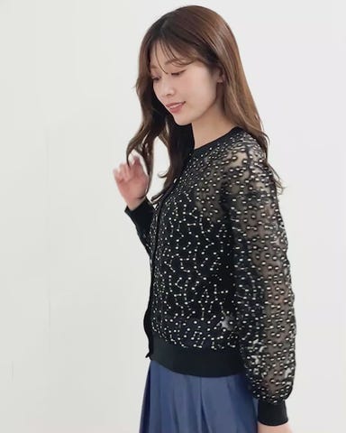 ・立体感のあるフラワー刺繍が目を惹くシアーカーディガン。