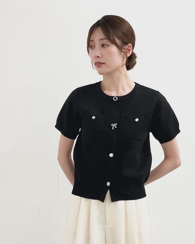 ・ビジューが華やかなアクセントになった半袖ニットカーディガン。