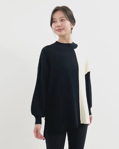 ・ネックから裾にかけて落ちる配色切り替えが、縦ラインを強調して、スタイルアップ効果も引きたてます。