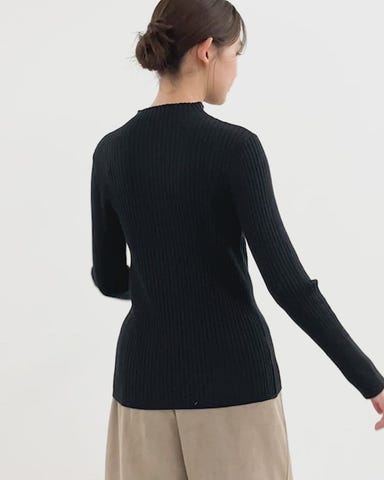 ・縦のラインを強調するリブ編み、首元は詰まりすぎないモックネック