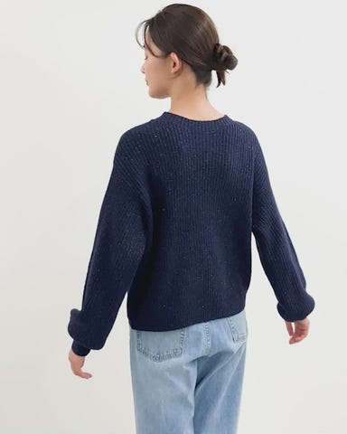 ・肩口から中心に向かって斜めに入った編地が、着用時にスッキリとした印象を与えてくれるデザインです。