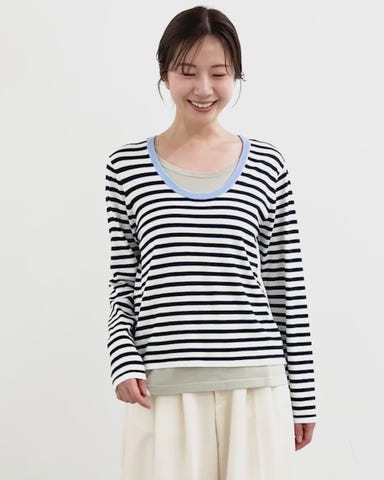 ・絶妙な配色バランス:ボーダー柄に映える襟元のアクセントカラーが、顔まわりを明るく演出。シンプルながらも都会的で洗練された印象に導きます。