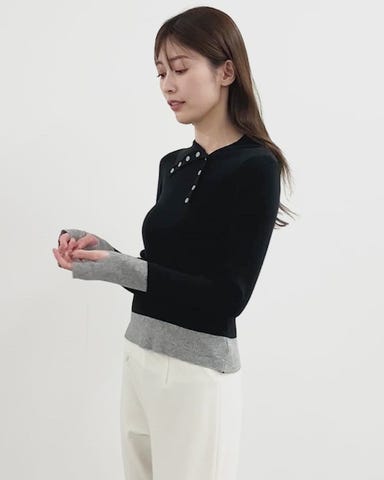 ・アシンメトリーなボタンディテール: 襟元から肩にかけて並んだ配色ボタンが、顔まわりに視線を集めるさりげないアクセントに。