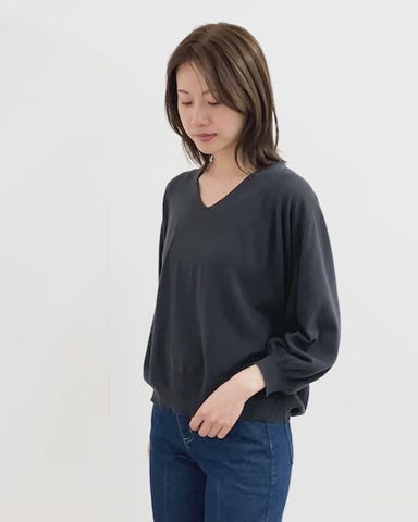 ・首元をすっきり見せてくれるカルマネック(深めのVネック)が抜け感を演出します。