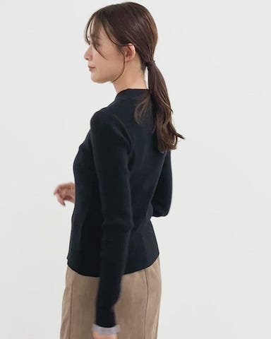 ・首元は上品な高さのハイネックで、顔周りをすっきりと見せます。