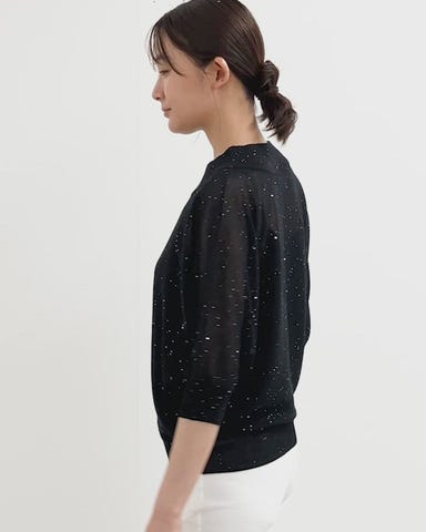 ・キラキラと光るスパンコールがあしらわれた透け感のあるニットプルオーバー。