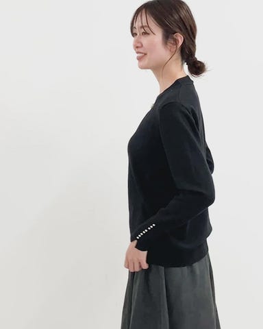 ・長めの袖口リブが手首周りをすっきりと見せ、ブラウジングなどのアレンジも可能なデザイン。