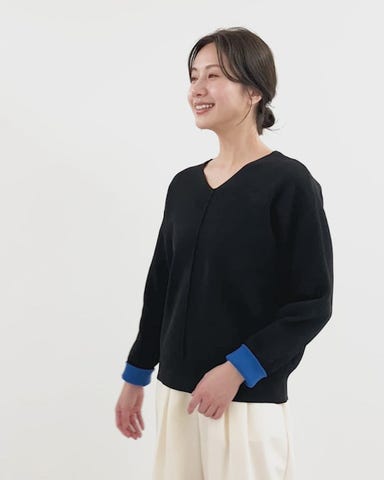 ・深すぎないVネックラインが、インナーとのレイヤードを楽しみつつ顔周りをシャープに演出。
