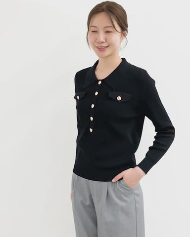 ・トレンド感のある襟付きデザインが印象的なニットトップス。