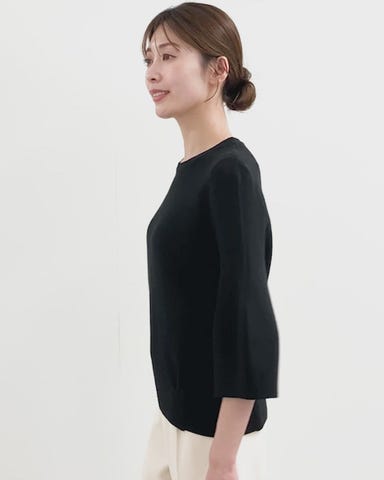 ・装飾を抑えたシンプルなクルーネックは、アクセサリーやスカーフが映え、オンオフ問わず着用しやすい首元に。