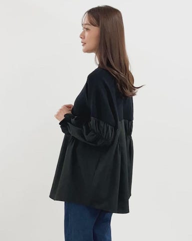 ・下身頃と袖は滑らかな布帛素材で、カジュアルすぎない上品な印象を与えます。