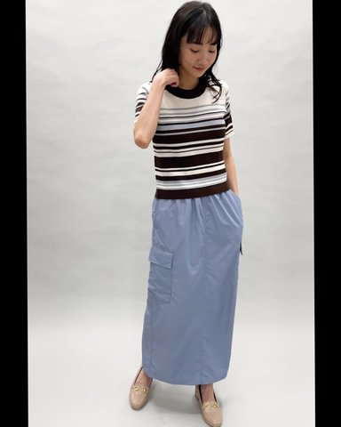 マルチカラーのボーダーがキャッチーなリブ編みマルチボーダー半袖ニット。
