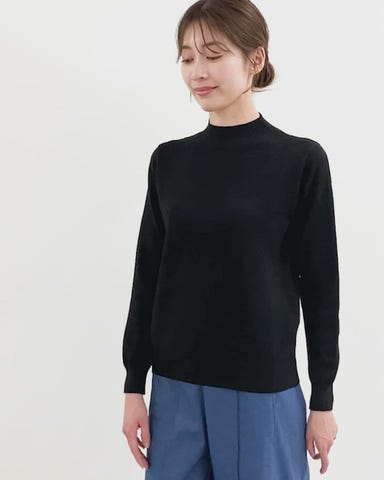 ・首元はリブ編みのモックネックで、顔周りをすっきりと見せつつ、暖かさをキープ。