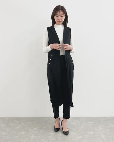 ・深めのVライン: 首元をシャープに見せるノーカラー設計。タートルネックやブラウス、シンプルなカットソーなどインナーを選ばずレイヤードを楽しめます。