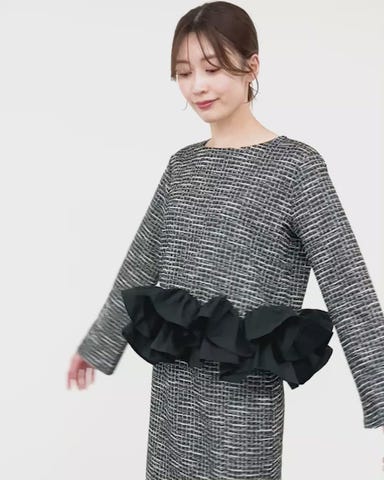 ・ツイード調の柄と無地のフリルの異素材コンビが、デザイン全体に奥行きを加える。