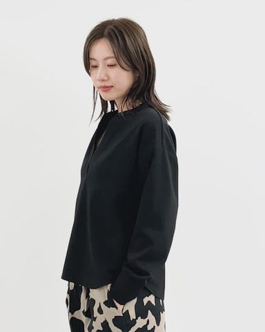 ・深めのV字に開いたスキッパーネックが、顔周りをすっきり見せ、女性らしいデコルテを強調。