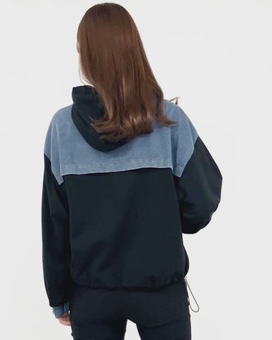 ・胸元で切り替えられたデニム素材が、カジュアルなフーディをモードに昇華させるアクセント。
