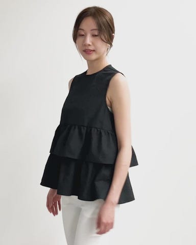 ウエストを切り替えた二重のペプラムフリルデザインが着映えするブラウス。