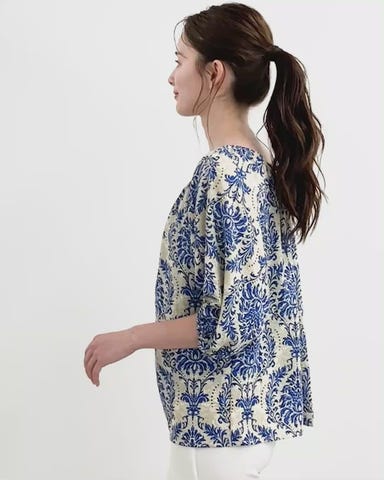 鮮やかなプリント柄が華やかな印象を与えるブラウス。