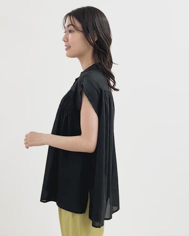 胸元のシャーリングと袖口にほどこしたピンタックの掛け合わせが上品なノースリーブブラウス。