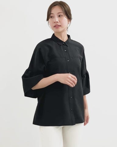 ・手元に広がるフレアースリーブが、手首をすっきり細く見せてくれる華やかデザインブラウス。